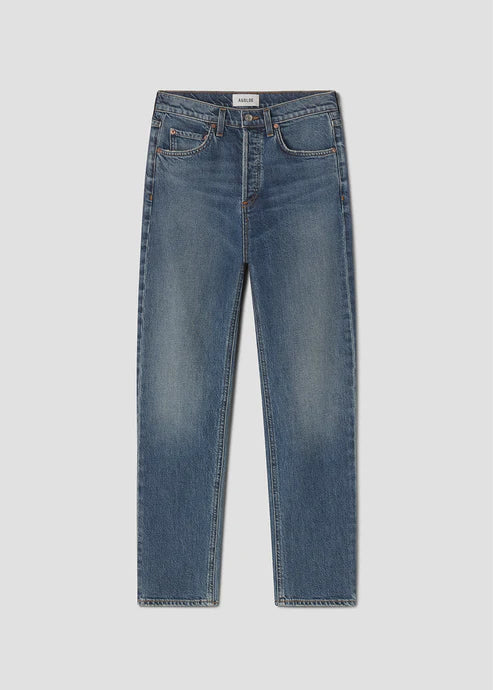 The 90’s Pinch Waist Long in Overcast features a medium to dark tinted indigo wash with soft fading and marbling for a broken-in look. Cut from lightweight comfort stretch denim, it’s designed to hold its shape while maintaining a soft, easy feel. The high-rise, straight-leg fit and 32" inseam create a clean, lengthened silhouette.